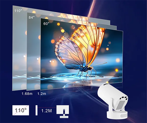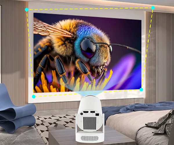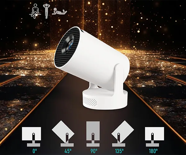 CIRON HY300 Ultra wyposażono w automatyczną korekcję zniekształceń trapezowych – ustawiasz projektor pod dowolnym kątem, a system w kilka sekund wyrównuje obraz do prostokąta. Regulacja ostrości odbywa się ręcznie, co pozwala precyzyjnie dopasować wyświetlany obraz do odległości 0.6–2.5 metra. Elastyczny obrót o 180° daje możliwość rzutowania na ścianę, sufit czy dowolną powierzchnię – oglądasz filmy siedząc, leżąc w łóżku, a nawet stojąc.
