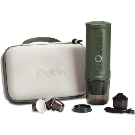 - Zestaw Traveler Gift Set to zielony przenośny ekspres do kawy Outin Nano z etui. Parzy espresso z zimnej wody w 3 minuty, oferując 20 barów mocy. Idealny dla miłośnika dobrej kawy w podróży.