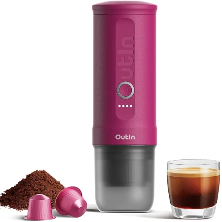 - Czerwony przenośny ekspres do kawy Outin Nano to moc 20 barów. Zaparzy espresso z zimnej wody w 3 minuty, obsługując kapsułki Nespresso® Original i kawę mieloną. Cieszysz się smakiem kawy z ulubionej kawiarni w każdej podróży.