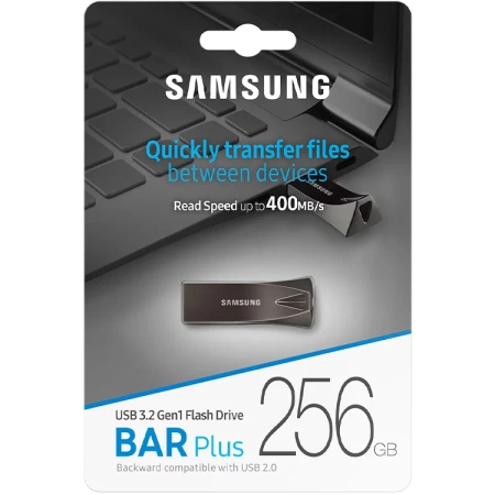 • Samsung BAR Plus 256GB to szybki pendrive USB 3.2 o prędkości odczytu do 400 MB/s. Metalowa obudowa chroni Twoje dane przed wodą i wstrząsami. Zyskujesz stylowy, ultra-wytrzymały nośnik, który zawsze masz pod ręką.
